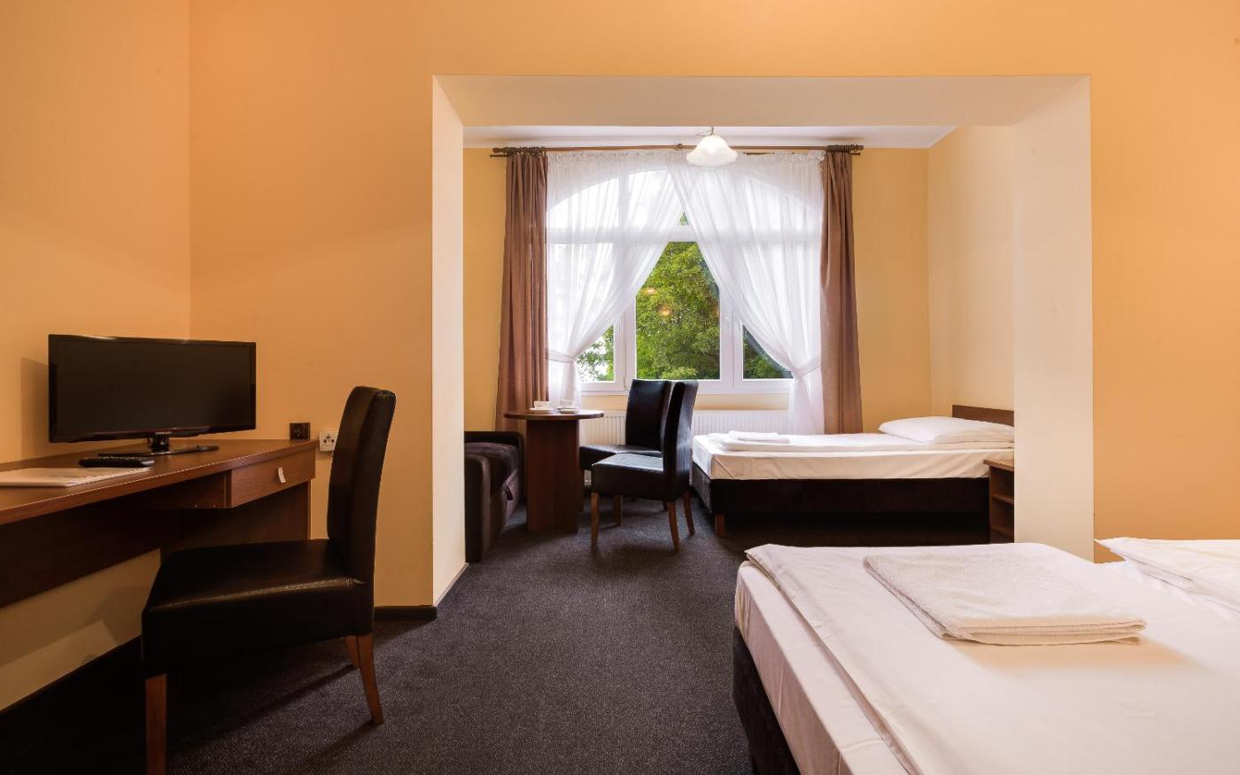 Pokój Czteroosobowy. The quadruple room offers a carpeted floor, heating, as well as a private bathroom featuring a shower. The quadruple room provides a flat-screen TV with satellite channels, a wardrobe, an electric kettle, a sofa as well as garden views. The unit offers 4 beds. Pokój Czteroosobowy - 4 osobowy. Powierzchnia pokoju ok.: 16 mkw. ;